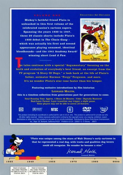 Mickey's faithful friend Pluto is unleashed in this first volume of the celebrated canine's cartoon capers. Spanning the years 1930 to 1947, these 29 classic shorts include Pluto's 1930 debut in The Chain Gang – which was actually his first and second appearance playing unnamed, identical bloodhounds – and the 1941 Academy Award-winning short Lend A Paw.The tales continue with a special "dogumentary" focusing on the birth and evolution of everybody's best friend, an excerpt from the TV program "A Story Of Dogs," a look back at the life of Pluto's father, animator Norman "Fergy" Ferguson and more. It's no wonder Pluto's star rose faster than his temper.Featuring exclusive introductions by film historian LEONARD MALTIN, this is a timeless collection from generations past for generations to come.Disc 1 - The Shorts:1. The Chain Gang (1930)2. On Ice (1935)3. Pluto's Quin-puplets (1937)4. Beach Picnic (1939)5. Bone Trouble (1940)6. Pluto's Playmate (1941)7. Canine Caddy (1941)8. Lend a Paw (1941)9. Pluto, Junior (1942)10. The Army Mascot (1942)11. The Sleepwalker (1942)12. T-Bone for Two (1942)13. Pluto at the Zoo (1942)Disc 2 - The Shorts:14. Pluto and the Armadillo (1943)15. Private Pluto (1943)16. Springtime for Pluto (1944)17. First Aiders (1944)18. Dog Watch (1945)19. Canine Casanova (1945)20. The Legend of Coyote Rock (1945)21. Canine Patrol (1945)22. Pluto's Kid Brother (1946)23. In Dutch (1946)24. Squatter's Rights (1946)25. The Purloined Pup (1946)26. Pluto's Housewarming (1947)Disc 2 - From the Vault27. Pantry Pirate (1940)28. A Gentleman's Gentleman (1941)