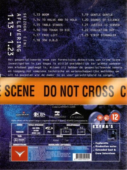 Het gespecialiseerde team van forensische detectives van Crime Scene Investigation in Las Vegas is altijd onmiddellijk ter plekke wanneer een misdaad gepleegd is. Alleen zij hebben de gespecialiseerde kennis en toegang tot complexe technische en wetenschappelijke methodes om uit te puzzelen wie de dader is en voor gerechtigheid te zorgen.CSI - Seizoen 1.2: DISC 11.13 Boom1.14 To Halve and to Hold1.15 Table Stakes1.16 Too Tough to DieDISC 21.17 Face Lift1.18 $35K O.B.O.1.19 Gentle, Gentle1.20 Sounds of SilenceDISC 31.21 Justice Is Served1.22 Evaluation Day1.23 The Strip Strangler