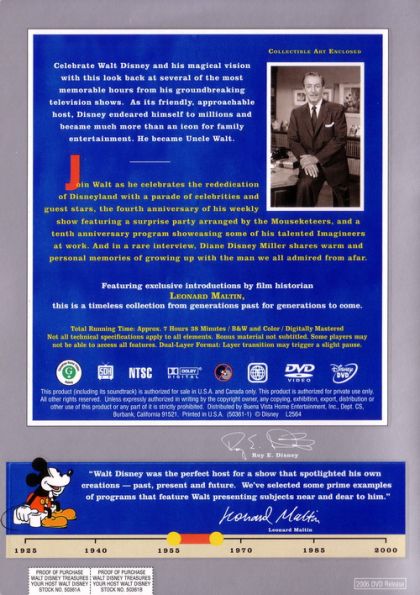 Celebrate Walt Disney and his magical vision with this look back at several of the most memorable hours from his groundbreaking television shows. As its friendly, approachable host, Disney endeared himself to millions and became much more than an icon for family entertainment. He became Uncle Walt. Join Walt as he celebrates the rededication of Disneyland with a parade of celebrities and guest stars, the fourth anniversary of his weekly show featuring a surprise party arranged by the Mouseketeers, and a tenth anniversary program showcasing some of his talented Imagineers at work. And in a rare interview, Diane Disney Miller shares warm and personal memories of growing up with the man we all admired from afar.Featuring exclusive introductions by film historian LEONARD MALTIN, this is a timeless collection from generations past for generations to come.