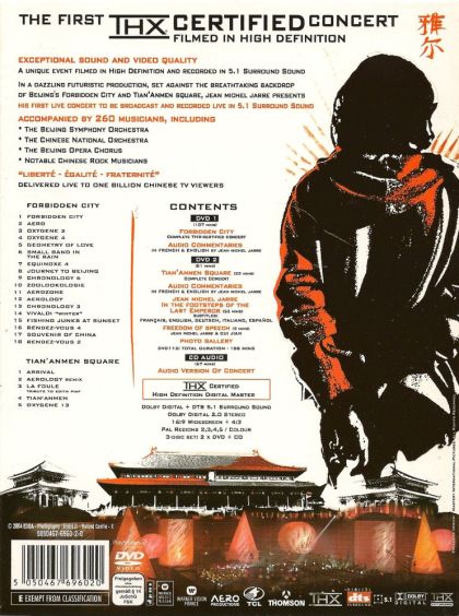 Le 10 octobre 2004, Jean-Michel Jarre a donné un concert au sein de la prestigieuse Cité Interdite à Pékin. Pour la première fois au monde, ce concert met en oeuvre une haute technologie inédite, au service de la créativité sonore et visuelle : le premier live joué en 5.1.DVD 1 - Cité Interdite - Concert complet (THX)01 - FORBIDDEN CITY02 - AERO03 - OXYGENE 204 - OXYGENE 405 - GEOMETRY OF LOVE06 - PETIT ORCHESTRE SOUS LA PLUIE07 - EQUINOXE 408 - VOYAGE A PEKIN09 - CHRONOLOGY 610 - ZOOLOOKOLOGIE11 - AEROZONE12 - AEROLOGY13 - CHRONOLOGY 314 - VIVALDI ''L'Hiver''15 - JONQUES DE PECHEURS AU CREPUSCULE16 - RENDEZ-VOUS 417 - SOUVENIR DE CHINE18 - RENDEZ-VOUS 2DVD 2 - Place Tian'anmen - Concert complet01 - ARRIVÉE02 - AEROLOGY Remix03 - LA FOULE (Hommage à Edith Piaf)04 - TIAN'ANMEN05 - OXYGENE 13Audio CD - (70 Min)01 - AERO02 - OXYGENE 203 - OXYGENE 404 - GEOMETRY OF LOVE05 - EQUINOXE 806 - EQUINOXE 407 - AEROZONE08 - CHRONOLOGY 609 - JONQUES DE PECHEURS10 - SOUVENIR DE CHINE11 - AEROLOGY Remix (Bonus Track)