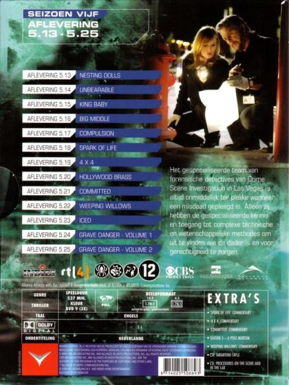 Het gespecialiseerde team van forensische detectives van Crime Scene Investigation in Las Vegas is altijd onmiddellijk ter plekke wanneer een misdaad gepleegd is. Alleen zij hebben de gespecialiseerde kennis en toegang tot complexe technische en wetenschappelijke methodes om uit te vinden wie de dader is en voor gerechtigheid te zorgen.CSI - Seizoen 5.2DISC 15.13 Nesting Dolls5.14 Unbearable5.15 King Baby5.16 Big MiddleDISC 25.17 Compulsion5.18 Spark of Life5.19 4x45.20 Hollywood BrassDISC 35.21 Commited5.22 Weeping Willows5.23 Iced5.24 Grave Danger: Part 15.25 Grave Danger: Part 2