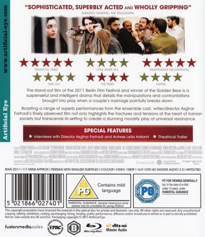 The stand-out film of the 2011 Berlin Film Festival and winner of the Golden Bear is a suspenseful and intelligent drama that details the manipulations and confrontations brought into play when a couple's marriage painfully breaks down.Boasting a range of superb performances from the ensemble cast, writer/director Asghar Farhadi's finely observed film not only highlights the fractures and tensions at the heart of Iranian society but transcends it setting to create a stunning morality play of universal resonance.