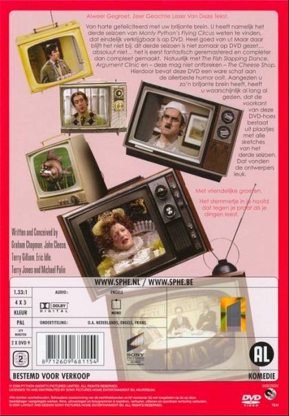Alweer Gegroet, Zeer Geachte Lezer Van Deze Tekst,Van harte gefeliciteerd met uw briljante brein. U heeft namelijk het derde seizoen van 'Monty Python's Flying Cicrus' weten te vinden, dat eindelijk verkrijgbaar is op DVD. Heel goed van u! Maar daar blijft het niet bij: dit derde seizoen is niet zomaar op DVD gezet... absoluut niet... het is eerst fantastisch geremastered en completer dan compleet gemaakt. Natuurlijk met 'The Fish Slapping Dance', 'Argument Clinic' en - deze mag niet ontbreken - 'The Cheese Shop'. Hierdoor bevat deze DVD een ware schat aan de allerbeste humor ooit. Aangezien u zo'n briljante brein heeft, heeft u waarschijnlijk al lang gezien, dat de voorkant deze DVD-hoes bestaat uit plaatjes met alle sketches van het derde seizoen. Dat vonden de ontwerpers leuk.Met vriendelijke groeten,Het stemmetje in je hoofddat tegen je praar als je dingen leest.
