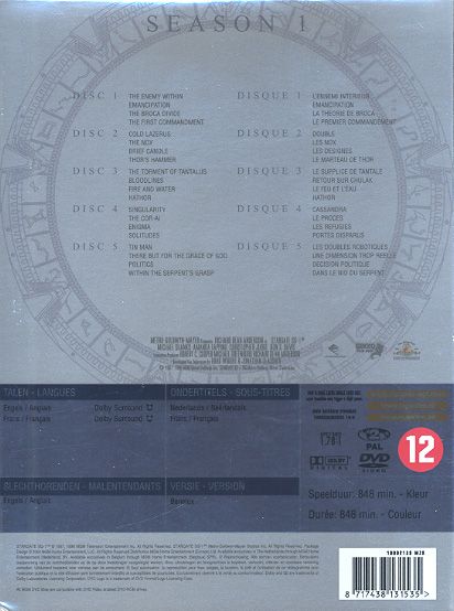 SEASON 1Disc 1: The Enemy Within Emancipation The Broca Divide The First CommandmentDisc 2: Cold Lazarus The Nox Brief Candle Thor's HammerDisc 3: The Torment Of Tantalus Bloodlines Fire And Water HathorDisc 4: Singularity Cor-ai Enigma SolitudesDisc 5: Tin Man There But For The Grace Of God Politics Within The Serpent's Grasp