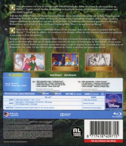 Disney presenteert vol trots de onvergetelijke tekenfilmklassieker Robin Hood voor de allereerste keer op Blu-ray™. Geniet van alle humor, de spanning en de geliefde muziek van dit legendarische avontuur met perfect beeld en geluid!Kijk mee hoe Robin Hood, zijn trouwe kameraad Kleine Jan en zijn hilarische bende van Vrolijke Volgelingen de hebzuchtige Prins Jan te sluw af zijn om de goede inwoners van Nottingham te redden. Robin vliegt van de ene dappere daad naar de volgende en rust niet tot hij de hand van Jonkvrouw Marian heeft gewonnen en Koning Richard weer op de troon zit. Een van Disney’s meest geliefde films is nu nog beter op Blu-ray™!