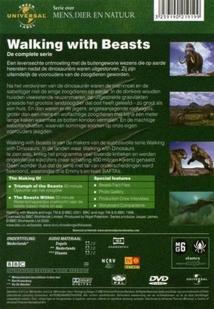 Een levensechte ontmoeting met de buitengewone wezens die op aarde heersten nadat de dinosauriërs waren uitgestorven. Zij zijn uiteindelijk de voorouders van de zoogdieren geworden. Na het verdwijnen van de dinosauriër waren de mammoet en de sabeltijger niet de enige zoogdieren op aarde. In de donkere wouden huisden vleesetende reuzenmieren, op uitgestrekte grasvlakten graasde het grootste landzoogdier dat ooit heeft geleefd - zo groot als een huis. En dan waren er de jagers: angstaanjagende roofvogels, groter dan een mens en wolfachtige zoogdieren met bijna één meter lange kaken waarmee ze botten kunnen vermalen. En de machtige sabeltandkatten, waarvan sommige soorten op onze eigen voorouders jaagden.Walking With Beasts is van de makers van de succesvolle serie Walking With Dinosaurs. In de landen waar Walking With Dinosaurs te zien was, kreeg het programma veel lovende kritieken en werden ongelofelijke kijkcijfers (naar schatting 400 miljoen kijkers) gehaald. Geen wonder dus dat de serie met tal van onderscheidingen werd bekroond, waaronder drie Emmy's en twee BAFTA's.