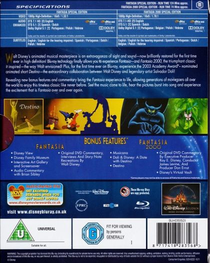 Walt Disney's animated musical masterpiece is an extravaganza of sight and sound — now brilliantly restored for the first time ever in high definition! Blu-ray technology finally allows you to experience Fantasia — and Fantasia 2000, the triumphant classic it inspired — the way Walt envisioned! Plus, for the first time ever on Blu-ray, experience the 2003 Academy Award®– nominated animated short Destino — the extraordinary collaboration between Walt Disney and legendary artist Salvador Dali!Revealing new bonus features and commentary bring the Fantasia experience to life, allowing generations of moviegoers all over the world to enjoy this timeless classic like never before. See the music come to life, hear the pictures burst into song and experience the excitement that is Fantasia over and over again.