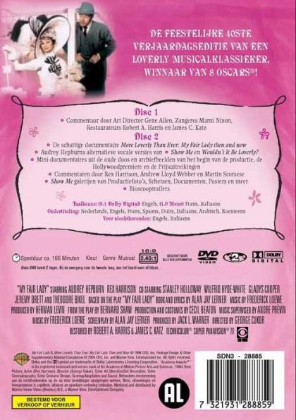 Warempel, ze zijn erin geslaagd! De digitale omzetting van de in 1994 nauwgezet gerestaureerde filmversie van de Lerner en Loewe musical 'My Fair Lady' is overdadig, beminnelijk en schitterend geslaagd. De alom gelauwerde film sleepte acht Oscar® in de wacht, waaronder Beste Film en Beste Regisseur (George Cukor).† Rex Harrison - die de Oscar® voor Beste Mannelijke Hoofdrol kreeg - herneemt zijn klassieke toneelrol als de hautaine Henry Higgins, de zelfverzekerde logopedist, die een bizarre weddenschap aangaat: onder zijn begeleiding zal Eliza Doolittle, het bloemenmeisje met het cockney-accent (Audrey Hepburn in één van haar meest geliefde vertolkingen), als hertogin verschijnen op het Embassy Ball. En als er één gezicht bestaat waar de professor wel mee kan leren leven, dan is het dat van Eliza, toch? Want in heel Hartford, Heresford en Hampshire (en waar dan ook) bestaat er niets mooiers dan 'My Fair Lady', één van de onweerstaanbaarste musicals ooit!