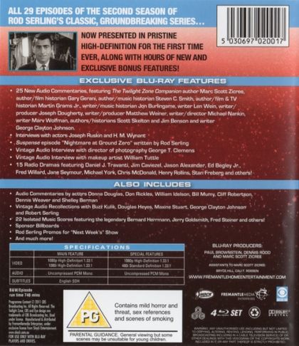 All 29 episodes of the second season of Rod Serling's classic, groundbreaking series...Now presented in pristine high-definition for the first time ever, along with hours of new and exclusive bonus features!Episodes:37 - King Nine Will Not Return38- The Man in the Bottle39 - Nervous Man in a Four-Dollar Room40 - A Thing About Machines41 - The Howling Man42 - Eye of the Beholder43 - Nick of Time44 - The Lateness of the Hour45 - The Trouble with Templeton46 - A Most Unusual Camera47 - The Night of the Meek48 - Dust49 - Back There50 - The Whole Truth51 - The Invaders52 - A Penny for Your Thoughts53 - Twenty-Two54 - The Odyssey of Flight 3355 - Mr. Dingle, the Strong56 - Static57 - The Prime Mover58 - Long Distance Call59 - A Hundred Yards Over the Rim60 - The Rip Van Winkle Caper61 - The Silence62 - Shadow Play63 - The Mind and the Matter64 - Will the Real Martian Please Stand Up?65 - The Obsolete Man