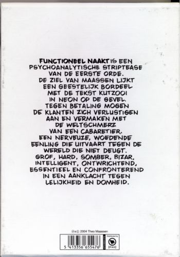 Functioneel naakt is een psychoanalystische striptease van de eerste orde. De ziel van Maassen lijkt een geestelijk bordeel met de tekst kutzooi in neon op de gevel. Tegen betaling mogen de klanten zich verlustigen aan en vermaken met de weltschmerz van een cabaretier. Een nerveuze, woedende eenling die uitvaart tegen de wereld die niet deugt. Grof, hard, somber, bizar, intelligent, ontwrichtend, essentieel en confronterend in een aanklacht tegen lelijkheid en domheid.