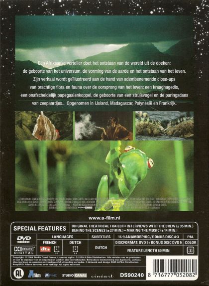 Een Afrikaanse verteller doet het ontstaan van de wereld uit de doeken: de geboorte van het universum, de vorming van de aarde en het ontstaan van het leven.Zijn verhaal wordt geillustreerd aan de hand van adembenemende close-ups van prachtige flora en fauna over de oorsprong van het leven: een kraaghagedis, een onafscheidelijk papagaaienkoppel, de geboorte van een struisvogel en de paringsdas van zeepaardjes....Opgenomen in Ijsland, Madagascar, Polynesie en Frankrijk/