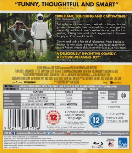 Set in the near future, Frank, a retired cat burglar, has two grown children who are concerned he can no longer live alone. Against the old man's wishes his son buys Frank a walking, talking humanoid robot programmed to improve his physical and mental health.Slowly, and with a fair bit of reluctance, Frank begins to accept his new digital companion, seeing an opportunity to use Robot's unique skills to try their luck as a heist team.