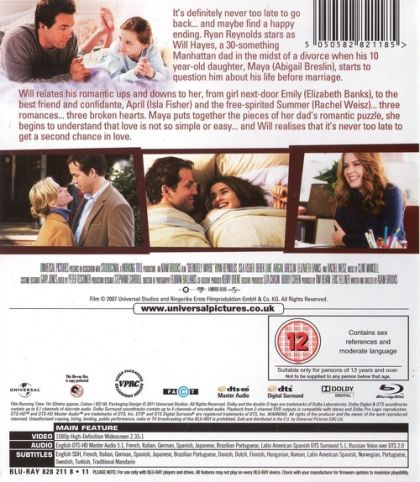 It's definitely never too late to go back... and maybe find a happy ending. Ryan Reynolds stars as Will Hayes, a 30-something Manhattan dad in the midst of a divorce when his 10 year-old daughter, Maya (Abigail Breslin), starts to question him about his life before marriage.Will relates his romantic ups and downs to her, from girl next-door Emily (Elizabeth Banks), to the best friend and confidante, April (Isla Fisher) and the free-spirited Summer (Rachel Weisz)... three romances... three broken hearts. Maya puts together the pieces of her dad's romantic puzzle, she begins to understand that love is not so simple or easy... and Will realises that it's never too late to get a second chance in love.