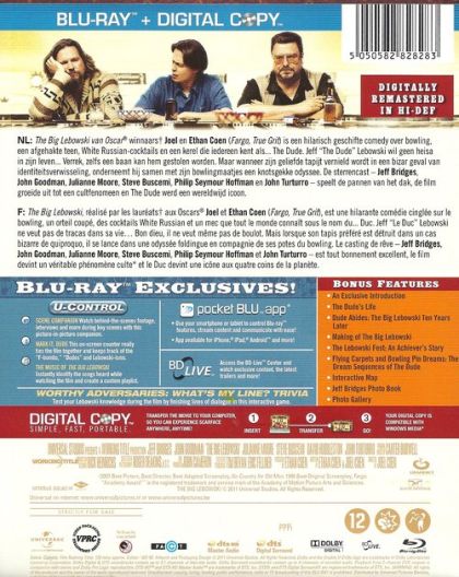 The Big Lebowski van Oscar® winnaars† Joel en Ethan Coen (Fargo, True Grit) is een hilarisch geschifte comedy over bowling, een afgehakte teen, White Russian-cocktails en een kerel die iedereen kent als... The Dude. Jeff "The Dude" Lebowski wil geen heisa in zijn leven... Verrek, zelfs een baan kan hem gestolen worden. Maar wanneer zijn geliefde tapijt vernield wordt in een bizar geval van identiteitsverwisseling, onderneemt hij samen met zijn bowlingmaatjes een knotsgekke odyssee. De sterrencast – Jeff Bridges, John Goodman, Julianne Moore, Steve Buscemi, Philip Seymour Hoffman en John Turturro – speelt de pannen van het dak, de film groeide uit tot een cultfenomeen en The Dude werd een wereldwijd icoon.†2007 Best Picture, Best Director, Best Adapted Screenplay, No Country for Old Men. 1996 Best Original Screenplay, Fargo.