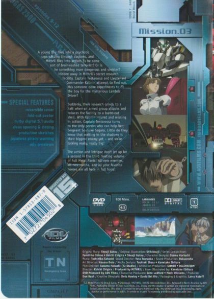 A young boy flies into a psychotic rage passing through customs, and Mithril flies into action. Is he some sort of brainwashed terrorist? Or is he something even more dangerous and sinister? Hidden away in Mithril’s secret research facility, Captain Testarossa and Lieutenant Commander Kalinin attempt to find out. Has someone done experiments to fit the boy for the mysterious Lambda Driver?Suddenly, their research grinds to a halt when an armed group attacks, reducing the facility to a burnt-out shell. With Kalinin injured and missing in action, Captain Testarossa turns to the only person who can help her: Sergeant Sousuke Sagara. Little do they know that waiting in the shadows is their biggest enemy yet - and we’re talking really, really big!The action and intrigue don't let up for a second in the third riveting volume of Full Metal Panic! All-new enemies, all-new mecha, and all your favorite heroes are all here in full force!