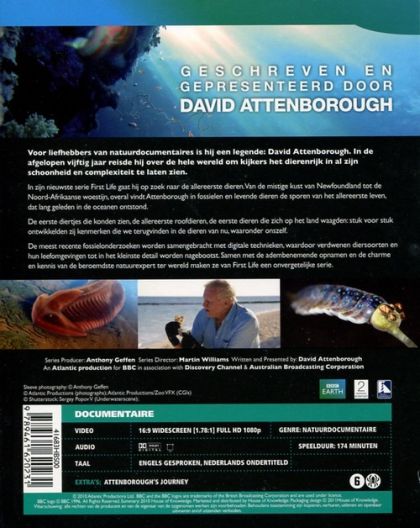 Voor liefhebbers van natuurdocumentaires is hij een legende: David Attenborough. In de afgelopen vijftig jaar reisde hij over de hele wereld om kijkers het dierenrijk in al zijn schoonheid en complexiteit te laten zien.In zijn nieuwste serie First Life gaat hij op zoek naar de allereerste dieren. Van de mistige kust van Newfoundland tot de Noord-Afrikaanse woestijn, overal vindt Attenborough in fossielen en levende dieren de sporen van het allereerste leven, dat lang geleden in de oceanen ontstond.De eerste diertjes die konden zien, de allereerste roofdieren, de eerste dieren die zich op het land waagden: stuk voor stuk ontwikkelden zij kenmerken die we terugvinden in de dieren van nu, waaronder onszelf.De meest recente fossielonderzoeken worden samengebracht met digitale technieken, waardoor verdwenen diersoorten en hun leefomgevingen tot in het kleinste detail worden nagebootst. Samen met de adembenemende opnamen en de charme en kennis van de beroemdste natuurexpert ter wereld maken ze van First Life een onvergetelijke serie.