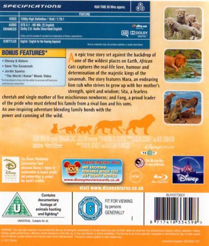 An epic true story set against the backdrop of one of the wildest places on Earth, African Cats captures the real-life love, humour and determination of the majestic kings of the savannah. The story features Mara, an endearing lion cub who strives to grow up with her mother's strength, spirit and wisdom; Sita, a fearless cheetah and single mother of five mischievous newborns; and Fang, a proud leader of the pride who must defend his family from a rival lion and his sons. An awe-inspiring adventure blending family bonds with the power and cunning of the wild.
