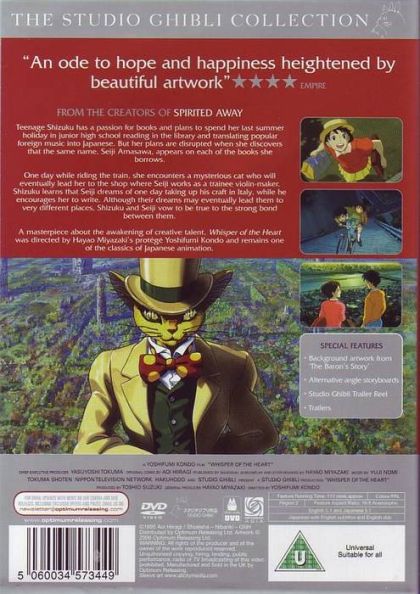 Teenage Shizuku has a passion for books and plans to spend her last summer holiday in junior high school reading in the library and translating popular foreign music into Japanese. But her plans are disrupted when she discovers that the same name, Seiji Amasawa, appears on each of the books she borrows.One day while riding the train, she encounters a mysterious cat who will eventually lead her to the shop where Seiji works as a trainee violin-maker. Shizuku learns that Seiji dreams of one day taking up his craft in Italy, while he encourages her to write. Although their dreams may eventually lead them to very different places, Shizuku and Seiji vow to be true to the strong bond between them. A masterpiece about the awakening of creative talent, Whisper of the Heart was directed by Hayao Miyazaki's protégé Yoshifumi Kondo and remains one of the classics of Japanes animation.