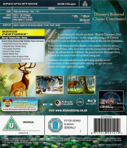 All your favourite friends are back - Bambi, Thumper, Owl, Flower and Faline - in this magnificent Special Edition of Bambi 2 - now available for the first time in Blu-ray Hi-Definition.Return to the forest and join Bambi as he reunites with his father, The Great Prince, who must now raise the young fawn on his own. But in the adventure of a lifetime, the proud parent discovers there is much he can learn from his spirited young son.Celebrate the unbreakable bonds of famiyl and the power of frienship in this unforgettable coming-of-age tale your family will enjoy again and again.