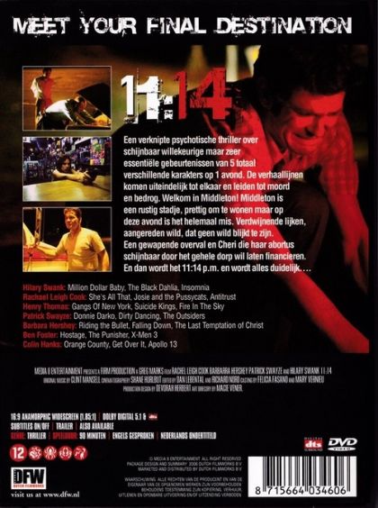Een verknipte psychotische thriller over schijnbaar willekeurige maar zeer essentiële gebeurtenissen van 5 totaal verschillende karakters op 1 avond. De verhaallijnen komen uiteindelijk tot elkaar en leiden tot moord en bedrog. Welkom in Middleton! Middleton is een rustig stadje, prettig om te wonen maar op deze avond is het helmaaal mis. Verdwijnende lijken, aangereden wild, dat geen wild blijkt te zijn. Een gewapende overval en Cheri die haar abortus schijnbaar door het gehele dorp wil laten financieren. En dan wordt het 11:14 p.m. en wordt alles duidelijk...