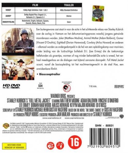 Een buitengewone cast staat in voor actie in het schitterende relaas van Stanley Kubrick over de oorlog in Vietnam en het dehumaniseringsproces waarbij jongens getrainde moordenaars worden. Joker (Matthew Modine), Animal Mother (Adam Baldwin), Gomer (Vincent D'Onofrio), Eightball (Dorian Harewood), Cowboy (Arliss Howard) en anderen - allemaal worden ze ondergedompeld in de hel van een opleidingskamp voor mariniers onder leiding van de luidruchtige bullebak D.I. (Lee Ermey) die de toekomstige hellehonden als groentjes, wormen of nog minder behandelt. De actie is wreed, het verhaal meedogenloos en de dialogen met bijtend sarcasme doorspekt. Full Metal Jacket scoort, vanaf de basisopleiding tot het nachtmerriegevecht in de stad Hue, een onmiskenbare filmhit.