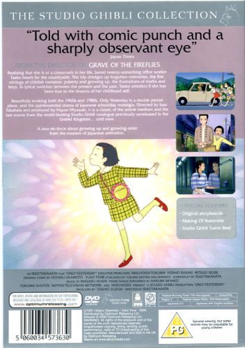 Realising that she is at a crossroads in her life, bored twenty-something office worker Taeko heads for the countryside. The trip dredges up forgotten memories, the first stirrings of childish romance, puberty and growing up, the frustrations of maths and boys. In lyrical switches between the present and the past, Taeko wonders if she has been true to the dreams of her childhood self.Beautifully evoking both the 1960s and 1980s, Only Yesterday is a double period piece, and the quintessential drama of Japanese schoolday nostalgia. Directed by Isao Takahata and produced by Hayao Miyazaki, it is a classic of the anime medium and the last movie from the world-beating Studio Ghibli catalogue previously unreleased in the United Kingdom… until now.A tour-de-force about growing up and growing older from the masters of Japanese animation.