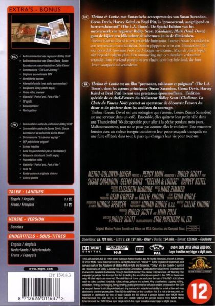 Thelma & Louise, met fantastische acteerprestaties van Susan Sarandon, Geena Davis, Harvey Keitel en Brad Pitt, is "provocerend, aangrijpend en hartverscheurend" (The L.A. Times). De Special Edition van het meesterwerk van regisseur Ridley Scott (Gladiator, Black Hawk Down) gunt de kijker een blik achter de schermen en in de filmkeuken.Thelma (Geena Davis) is een verveelde huisvrouw. Louise (Susan Sarandon) is een serveerster in een koffiebar. Samen glippen ze er in een Thunderbird '66 met open dak tussenuit voor een 3-daagse visvakantie. Maar de zaken lopen niet bepaald volgens plan. Een ontmoeting met een dronken verkrachter verandert hun weekend opeens in een vlucht door het hele land, die hun leven voorgoed zal veranderen.