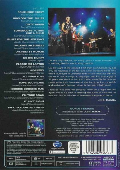 Let me say that for so many years I have dreamed of something like this event being possible.On the night of the concert, I felt truly overwhelmed by not only the response of the four and a half thousand blues fans who'd journeyed to Liverpool from far and wide but with the fun we all had on stage. To play again with Eric after a gap of 38 years was like time had just melted away. By the time we came to the finale I was almost shocked to look at my watch and realize we'd been on stage for two and a half hours!I foresee that there will probably never be a night like this again and so it's such a blessing that it was all captured on tape and film for all of us to treasure in the years to come.Set List:- Southside Story- Kids Got The Blues- Dirty Water- Somebody's Acting Like A Child- Blues For The Lost Days- Walking On Sunset- Oh, Pretty Woman- No Big Hurry- Please Mr Lofton- Hideaway- All Your Love- Have You Heard- Hoochie Coochie Man- I'm Tore Down- It Ain't Right- Talk To Your Daughter