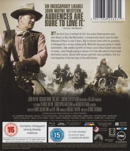 John Wayne is Jacob McCandles, a rough-and-tumble rancher who's estranged from his wife (Maureen O'Hara). But when a cutthroat gang led by Richard Boone kidnaps his grandson, Big Jake gets the call to rescue him. Patrick Wayne (John Wayne's real-life son) and Chris Mitchum (Robert Mitchum's son) play Jake's grown boys, who accompany him on the long trek that can end only one way...