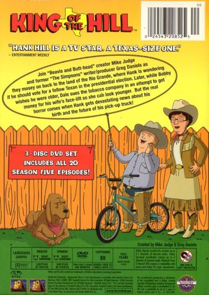Join "Beavis and Butt-head" creator Mike Judge and former "The Simpsons" writer/producer Greg Daniels as they mosey on back to the land of the Rio Grande, where Hank is wondering if he should vote for a fellow Texan in the presidential election. Later, while Bobby wishes he were older, Dale sues the tobacco company in an attempt to get money for his wife's face-lift so she can look younger. But the real horror comes when Hank gets devastating news about his birth and the future of his pick-up truck!Episodes:1. The Perils of Polling2. The Buck Stops Here3. I Don't Want To Wait For Our Lives To Be Over, I Want To Know Right Now, Will It Be... Sorry. Do Do Doo Do Do, Do Do Doo Do Do, Do Do Doo Do Do, Doo...4. Spin The Choice5. Peggy Makes The Big Leagues6. When Cotton Comes Marching Home7. What Makes Bobby Run?8. 'Twas The Nut Before Christmas9. Chasing Bobby10. Yankee Hankie11. Hank And The Great Glass Elevator12. Now Who's The Dummy?13. Ho Yeah!14. The Exterminator15. Luanne, Version 2.016. Hank's Choice17. It's Not Easy Being Green18. The Trouble with Gribbles19. Hank's Back Story20. Kidney Boy And Hamster Girl: A Love Story