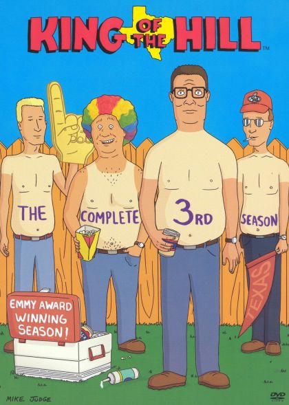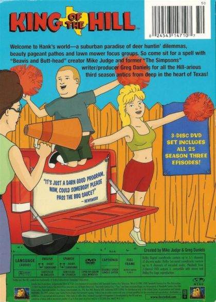 Welcome to Hank's world – a suburban paradise of deer huntin' dilemmas, beauty pageant pathos and lawn mower focus groups. So come sit for a spell with "Beavis and Butt-head" creator Mike Judge and former "The Simpsons" writer/producer Greg Daniels for all the Hill-arious third season antics from deep in the heart of Texas!Episodes:1. Death of a Propane Salesman: Part 22. And They Call it Bobby Love3. Peggy's Headache4. Pregnant Paws5. Next of Shin6. Peggy Pageant Fever7. Nine Pretty Darn Angry Men8. Good Hill Hunting9. Pretty, Pretty Dresses10. A Firefighting We Will Go11. To Spank, With Love12. Three Coaches and a Bobby13. De-Kahnstructing Henry14. The Wedding of Bobby Hill15. Sleight of Hank16. Jon Vitti Presents: Return to La Grunta17. Escape from Party Island18. Love Hurts...and so Does Art19. Hank's Cowboy Movie20. Dog Dale Afternoon21. Revenge of the Lutefisk22. Death and Taxes23. Wings of the Dope24. Take Me out of the Ball Game25. As Old as the Hills: Part 1