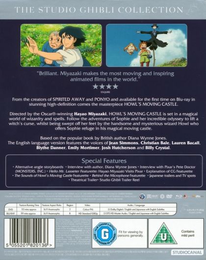 From the creators of SPIRITED AWAY and PONYO and available for the first time on Blu-ray in stunning high-definition comes the masterpiece HOWL'S MOVING CASTLE.Directed by Oscar®-winning Hayao Miyazaki. HOWL'S MOVING CASTLE is set in the magical world of wizardy and spells. Follow the adventures of Sophie and her incredible odyssey to lift a witch's curse, whilst being swept off her feet by the handsome and mysterious wizar Howl who offers Sophie refuge in his magical moving castle.Based on the popular book by British author Wynne Jones. The English language version features the voices of Jean Simmons, Christian Bale, Lauren Bacall, Blythe Danner, Emily Mortimer, Josh Hutcherson and Billy Crystal.