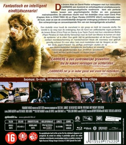 De broers Alex en David Pastor scheppen met hun debuutfilm CARRIERS een boeiend en onheilspellend eindtijdscenario. Deze postapocalyptische roadmovie kent een perfecte balans tussen een psychologische thriller en een pompeuze mainstreamfilm. De ademloze vlucht voor het dodelijke virus voert Chris Pine (Captain Kirk in STAR TREK XI) en Piper Perabo (COYOTE UGLY) rechtstreeks naar de kust, waar ze aan de onverbiddellijk dreigende ondergang proberen te ontkomen. Een scherpzinnige en zenuwslopende film van een beangstigende actualiteit.Een dodelijk virus houdt de mensheid in zijn greep en leidt tot massale sterfte. De wereld is op weg naar de ondergang. Aan de hand van zelfbedachte regels proberen de broers Brian (Chris Pine) en Danny (Lou Taylor Pucci) met hun vriendinnen Bobby (Piper Perabo) en Kate (Emily Vancamp) naar de Golf van Mexico te komen om daar de epidemie 'uit te zitten' . Dus geldt: blijf bij geïnfecteerden uit de buurt! Draag bij contact mondbescherming en handschoenen! Maak elk voorwerp voor gebruik grondig schoon! En voor alles: heb nooit medelijden met de 'dragers', ze zijn ten dode opgeschreven! Op stoffige snelwegen stuiten ze op aan elektriciteitspalen bungelende slachtoffers en vreselijk misvormde geïnfecteerden. Een eindeloze spooktocht door verlaten landschappen en steden begint ...