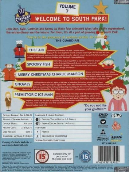 The insanity that is South Park is captured in these four outrageous episodes from Series 2. South Park - where the extraordinary and the unbelievable are just part of everyday life.VOLUME 7CHEF AIDChef faces jail unless he can raise 2 million dollars to pay off the slimy Capitalist Records company. Learning for the first time that Chef is a legend in the music business, the boys unite the town for a benefit concert. Chef Aid, to bail him out. Some of Chef's famous friends drop by to lend a hand including Sir Elton John and Meatloaf.SPOOKY FISHWhen Stan is given a goldfish as a present, the first night it kills two people! Meanwhile there is something seriously wrong with Cartman, eventuallly Chef and the rest of the boys discover that Cartman and the spooky fish have come from an evil parallel universe. Kyle, Kenny, Stan and Chef join forces to restore order in South Park.MERRY CHRISTMAS CHARLIE MANSONWhen Stan’s parents say no to a road trip to Cartman’s Grandma’s house, Stan sneaks out to join Kyle, Kenny and Cartman anyway. Dinner with Cartman’s family takes a bizarre twist when their Uncle Howard shows up with a special friend, after breaking out of prison, and the holiday results in a police standoff.GNOMESThe boys have to turn in a report to the town to prove that Mr Garrison actually teaches them something. Kyle, Kenny, Stan and Cartman are put in a group with Tweek who wants to write a report on the gnomes that he believes are coming into his house and stealing his underpants. However Tweek's father, the owner of the local coffee shop, offers an easier alternative as he writes the report for them on how large corporations try to push out small companies.PREHISTORIC ICE MANWhile attempting to rescue Kyle from the the bottom of a snowy crevice, the boys discover a man embedded in a block of ice. The world watches while South Park's resident genetic engineer, Mephesto, studies the 'Ice Man' as a possible missing link between prehistoric man and the modern era. However, events involving the 'new find' cause tension between Stan and his best friend Kyle.