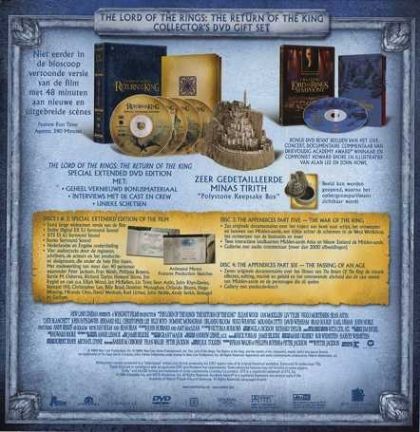 Niet eerder in de bioscoop vertoonde versie van de film met 48 minuten aan nieuwe uitgebreide scènes'The Lord of the Rings: The Return of the King' Special Extended DVD EditionDiscs 1 & 2: Special Extended Edition of the FilmDisc 3: The Appendices Part Five - The War of the RingDisc 4: The Appendices Part Six - The Passing of an AgeTevens in deze box:- Creating Lord of the Rings SymphonyBonus DVD bevat beelden van het live concert, documentaire commentaar van drievoudig Academy Award winnaar en componist Howard Shore en illustrates van Alan Lee en John Howe.- Zeer Gedetailleerde Minas Tirith "Polystone Keepsake Box"