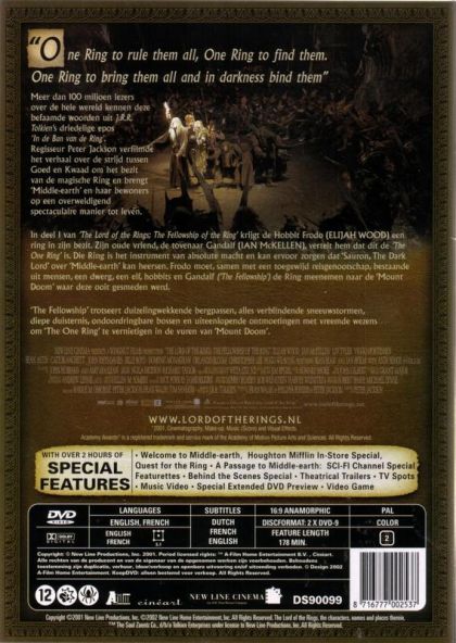 "One Ring to rule them all, One Ring to find them.One Ring to bring them all and in darkness bind them"Meer dan 100 miljoen lezers over de hele wereld kennen deze befaamde woorden uit J.R.R. Tolkien's driedelige epos 'In de Ban van de Ring'.Regisseur Peter Jackson verfilmde het verhaal over de strijd tussen Goed en Kwaad om het bezit van de magische Ring en brengt 'Middle-earth' en haar bewoners op een overweldigend spectaculaire manier tot leven.In deel 1 van 'The Lord of the Rings; The Fellowship of the Ring' krijgt de Hobbit Frodo (ELIJAH WOOD) een ring in zijn bezit. Zijn oude vriend, de tovenaar Gandalf (IAN McKELLEN), vertelt hem dat dit de 'The One Ring' is. Die Ring is het instrument van absolute macht en kan ervoor zorgen dat 'Sauron, The Dark Lord' over 'Middle-earth' kan heersen. Frodo moet, samen met een toegewijd reisgenootschap, bestaande uit mensen, een dwerg, een elf, hobbits en Gandalf ('The Fellowship') de Ring meenemen naar de 'Mount Doom' waar deze ooit gesmeden werd.'The Fellowship' trotseert duizelingwekkende bergpassen, alles verblindende sneeuwstormen, diepe duisternis, ondoordringbare bossen en uiteenlopende ontmoetingen met vreemde wezens om 'The One Ring' te vernietigen in de vuren van 'Mount Doom'.