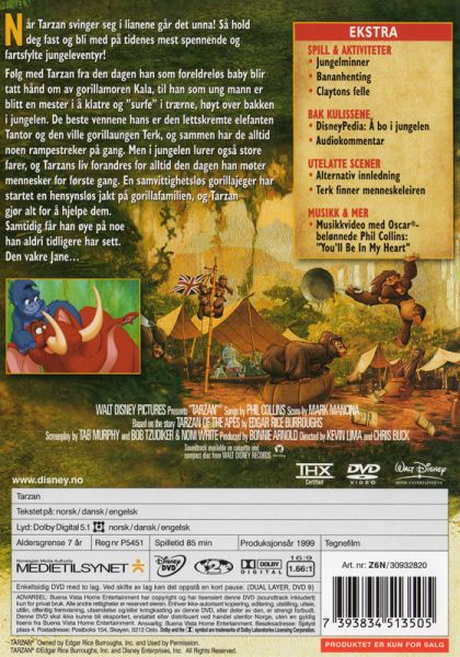 Een wild exotisch avontuur en grappige tekenfilmdieren die je doen bulderen van het lachen! Dat is Disney's prachtige versie van het klassieke en bekende verhaal van Edgar Rice Burroughs over de aapmens TARZAN®.Diep in de Afrikaanse jungle geeft een gorillamoeder een achtergelaten baby de naam "Tarzan" en neemt hem aan als haar eigen zoon, ook al schuwt de leider, de zilverrug Kerchak, dit "onbehaarde wonder".Tarzan groeit op met zijn bijdehante apenvriendje Tuk en zijn neurotische kameraad, de olifant Tantor. Zo ontwikkelt hij alle instincten van een dier en leert hij alles over de jungle, terwijl hij razendsnel door de bomen zweeft en zwaait. Maar als plotseling zijn soortgenoten verschijnen, waaronder de beeldschone Jane, staan twee werelden op het punt één te worden.Begeleid door vijf krachtige songs, geschreven door de superster Phil Collins, maakt Disney van TARZAN® een ongelooflijk avontuur met belangrijke lessen over acceptatie en familie!