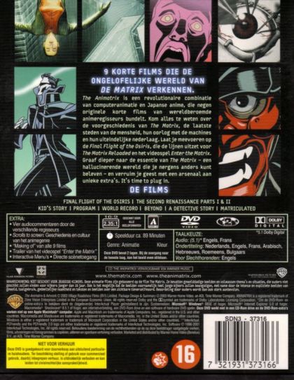 The Animatrix is een revolutionaire combinatie van computeranimatie en Japanse anime, die negen originele korte films van wereldberoemde animeregisseurs bundelt. Kom alles te weten over de voorgeschiedenis van The Matrix, de laatste steden van de mensheid, hun oorlog met de machines en hun uiteindelijke nederlaag. Laat je meevoeren op de Final Flight of the Osiris, die de lijnen uitzet voor The Matrix Reloaded en het videospel Enter the Matrix. Graaf dieper naar de essentie van The Matrix – een hallucinerende wereld die je nergens anders kunt beleven – en verruim je geest met een arsenaal aan unieke extra's. It’s time to plug in.De Films:- Final Flight of The Osiris- The Second Renaissance parts I & II- Kid's Story- Program- World Record- Beyond- A Detective Story- Matriculated