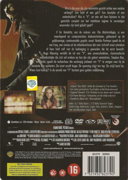 Wie is die man die zijn verminkte gezicht achter een masker verbergt? Een held of een gek? Een bevrijder of een onderdrukker. Wie is "V", en wie zal hem bijstaan in zijn gedurfde complot om het totalitaire regime te vernietigen waaronder zijn land gebukt gaat?V for Vendetta, van de makers van The Matrix-trilogie, is een meeslepend en compromisloos toekomstvisioen, gebaseerd op de gelijknamige, controversiële graphic novel. Natalie Portman speelt de rol van Evey, een meisje uit de arbeidersklasse dat voor zichzelf moet uitmaken of haar held zelf niet de bedreiging is geworden die hij eerst bevocht. Hugo Weaving vertolkt de rol van "V", een onverschrokken, charismatische vrijheidsstrijder die zich wil wreken op hen die zijn gelaat verminkten. Stephen Rea, ten slotte, speelt de rechercheur die wanhopig probeert om "V" te vangen voor hij de revolutie kan opstarten. De inzet wordt hoger. De spanning stijgt ten top. De strijd barst los. Wiens kant kies jij? In de wereld van "V" bestaat geen gulden middenweg.