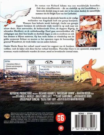 De roman van Richard Adams was een wereldwijde bestseller. Ook deze tekenfilmversie - die nu eindelijk op dvd beschikbaar is - betoverde destijds jong en oud, niet in het minst dankzij de onsterfelijke nummer één hit Bright Eyes van Art Garfunkel.Verscholen tussen de glooiende heuvels en de vredige weilanden van Engeland leeft een groep konijnen. Wanneer hun kolonie wordt bedreigd, vlucht een groepje dappere konijnen de onbekende wijde wereld in op zoek naar een nieuw thuis. Hun aanvoerder, de helderziende Fiver, de dappere Bigwig, de schrandere Blackberry en de eerbiedwaardige Hazel gaan onverschrokken alle uitdagingen aan; door hun kracht en sluwheid slagen ze erin te overleven en ook hun dromen te blijven nastreven. Op hun tocht sluiten ze vriendschap met de gekke zeemeeuw Kehaar en moeten ze het opnemen tegen de boosaardige generaal Woundwort, de wrede leider van een andere kolonie.Omdat Martin Rosen het verhaal vooral vanuit het oogpunt van de konijnen verfilmt, voelt de kijker zich direct bij het verhaal betrokken. Watership Down is een spannend, aangrijpend avontuur, waarin traditionele waarden als trouw, moed en levenskracht centraal staan.