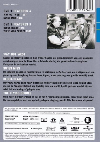 WAY OUT WEST (1937)Laurel en Hardy moeten in het Wilde Westen de eigendomsakte van een goudmijn overhandigen aan de lieve Mary Roberts die bij de gewetenloze kroegbaas Finlayson in de keuken werkt. SWISS MISS (1938)De jongens proberen muizenvallen te verkopen in Zwitserland en eindigen met een piano op een hangbrug tussen twee Alpen, waar ook nog een gorilla voorbij moet.BLOCK-HEADS (1938)Mevrouw Hardy pakt haar biezen als Oliver thuiskomt met zijn oude vriend Stan, die na de wapenstilstand nog twintig jaar op wacht heeft gestaan omdat hij niet wist dat de oorlog afgelopen was.THE FLYING DEUCES (1939)Ollie heeft liefdesverdriet en wil in het Vreemdelingenlegioen, maar Stan moet mee. Na een ongelukje met een op hol geslagen vliegtuig wordt Ollie herboren als paard.