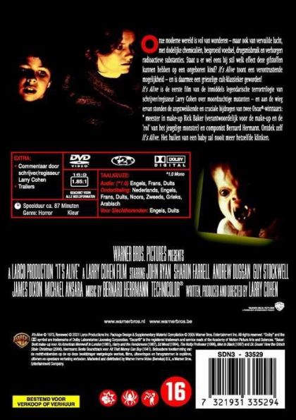 Onze moderne wereld is vol van wonderen - maar ook van vervuilde lucht met dodelijke chemicaliën, besproeid voedsel, drugsmisbruik en verborgen radioactieve substanties. Staat u er wel eens bij stil welk effect deze gifstoffen kunnen hebben op een ongeboren kind? 'It's Alive' toont een verontrustende mogelijkheid - en is daarmee een griezelige cult-klassieker geworden!'It's Alive' is de eerste film van de inmiddels legendarische terrortrilogie van schrijver/regisseur Larry Cohen over moordzuchtige mutanten - en aan de wieg ervan stonden de angstwekkende en cruciale bijdragen van twee Oscar®-winnaars: meester in make-up Rick Baker (verantwoordelijk voor de make-up en de 'rol' van het jeugdige monster) en componist Bernard Hermann. Ontdek zelf 'It's Alive'. Het huilen van een baby zal nooit meer hetzelfde klinken.