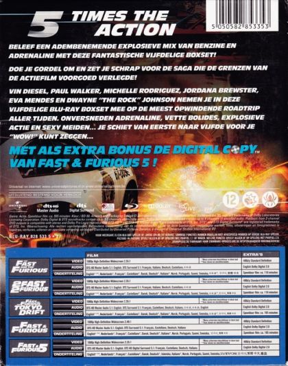 Beleef een adembenemende explosieve mix van benzine en adrenaline met deze fantastische vijfdelige boxset.Doe je gordel om en zet je schrap voor de saga die de grenzen van de actiefilm voorgoed verlegde!Vin Diesel, Paul Walker, Michelle Rodriguez, Jordana Brewster, Eva Mendes en Dwayne "The Rock" Johnson nemen je in deze vijfdelige blu-ray boxset mee op de meest opwindende roadtrip aller tijden, onversneden adrenaline, vette bolides, explosieve actie en sexy meiden... Je schiet van eerste naar vijfde voor je "wow!" kunt zeggen...