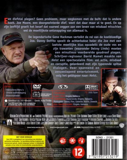 Een diefstal plegen? Geen probleem, maar wegkomen met de buit: dat is andere koek. Joe Moore, een doorgewinterde dief, weet dat daar maar al te goed. En op zijn leeftijd groeit het besef dat vaarwel zeggen aan een leven van misdaad misschien wel de moeilijkste ontsnapping van allemaal is.De legendarische Gene Hackman vertolkt de rol van de koelbloedige Joe. Danny DeVito speelt de achterbakse heler die Joe met een laatste moeilijke klus opzadelt: de oude vos en zijn trawanten (waaronder Delroy Lindo) moeten een minutieus voorbereide goudroof plegen. Schrijver-regisseur David Mamet maakte van Heist een spectaculaire film: vol actie, misdaad en corruptie, gelardeerd met zijn typerende spitse dialogen. Voor spannend en zenuwslopend entertainment, volg het geldspoor naar: Heist.