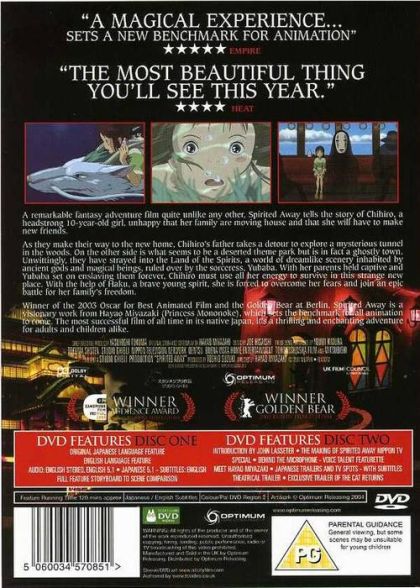 A remarkable fantasy adventure film quite unlike any other, Spirited Away tells the story of Chihiro, a headstrong 10-year-old girl, unhappy that her family are moving house and that she will have to make new friends.As they make their way to the new home, Chihiro's father takes a detour to explore a mysterious tunnel in the woods. On the other side is what seems to be a deserted theme park but is in fact a ghostly town. Unwittingly, they have strayed into the Land of the Spirits, a world of dreamlike scenery inhabited by ancient gods and magical beings, ruled over by the sorceress, Yubaba. With her parents held captive and Yubaba set on enslaving them forever, Chihiro must use all her energy to survive in this strange new place. With the help of Haku, a brave young spirit, she is forced to overcome her fears and join an epic battle for her family's freedom.Winner of the 2003 Oscar for Best Animateed Film and the Golden Bear at Berlin, Spirited Away is a visionary work from Hayao Miyazaki (Princess Mononoke), which sets the benchmark for all animation to come. The most successful film of all time in its native Japan, it's a thrilling and enchanting adventure for adults and children alike.