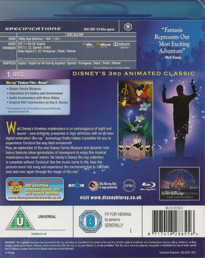 Walt Disney's timeless masterpiece is an extravaganza of sight and sound - now brilliantly presented in high definition with an all-new digital restoration! Blu-ray™ technology finally makes it possible for you to experience Fantasia the way Walt envisioned!Plus, an exploration of the new Disney Family Museum and dynamic new bonus features allow generations of moviegoers to enjoy this musical masterpiece like never before. No family's Disney Blu-ray collection is complete without Fantasia! See the music come to life, hear the pictures burst into song and experience the excitement that is Fantasia over and over again through the magic of Blu-ray!