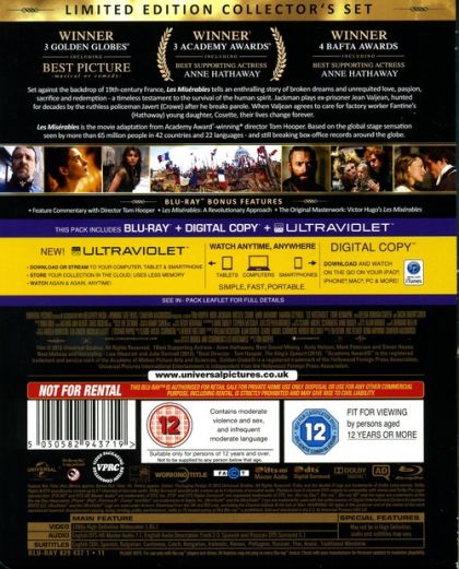 Set against the backdrop of 19th-century France, Les Misérables tells an enthralling story of broken dreams and unrequited love, passion, sacrifice and redemption - a timeless testament to the survival of the human spirit. Jackman plays ex-prisoner Jean Valjean, hunted for decades by the ruthless policeman Javert (Crowe) after he breaks parole. When Valjean agrees to care for factory worker Fantine's (Hathaway) young daughter, Cosette, their lives change forever.Les Misérables is the movie adaptation from Academy Award®-winning* director Tom Hooper. Based on the global stage sensation seen by more than 65 million people in 42 countries and 22 languages - and still breaking box-office records around the globe.* Best Director - Tom Hooper, The King's Speech (2010)