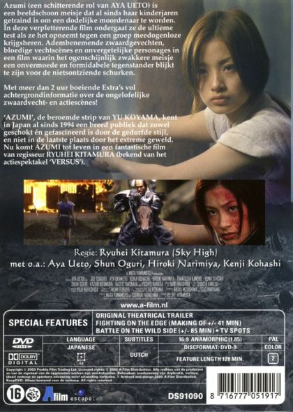 Azumi (een schitterende rol van AYA UETO) is een beeldschoon meisje dat al sinds haar kinderjaren getraind is om een dodelijke moordenaar te worden. In deze verpletterende film ondergaat ze de ultieme test als ze het opneemt tegen een groep meedogenloze krijgsheren. Adembenemende zwaardgevechten, bloedige vechtscènes en onvergetelijke personages in een film waarin het ogenschijnlijk zwakkere meisje een onvermoede en formidable tegenstander blijkt te zijn voor de nietsontziende schurken.Met meer dan 2 uur boeiende Extra's vol achtergrondinformatie over de ongelofelijke zwaardvecht- en actiescènes!'AZUMI', de beroemde strip van YU KOYAMA, kent in Japan al sinds 1994 een breed publiek dat zowel geschokt én gefascineerd is door de gedurfde stijl, en niet in de laatste plaats door het extreme geweld. Nu komt AZUMI tot leven in een fantastische film van regisseur RYUHEI KITAMURA (bekend van het actiespektakel 'VERSUS').