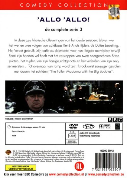 In deze zes hilarische afleveringen van het derde seizoen, blijven we het wel en wee volgen van cafébaas René Artois tijdens de Duitse bezetting. Het Verzet gebruikt zijn café als dekmantel voor hun illegale activiteiten terwijl René zijn handen vol heeft met het verstoppen van twee neergeschoten Britse piloten, het mijden van zijn bazige echtgenote en het verleiden van zijn sexy serveersters.... Tot overmaat van ramp wordt zijn 'knockwurst sausage' gestolen met daarin het schilderij "The Fallen Madonna with the Big Boobies".Afleveringen:01. The Nicked Knockwurst02. Gruber Does Some Mincing03. The Sausage in the Wardrobe04. Flight of Fancy05. Pretty Maids All in a Row06. The Great Un-Escape
