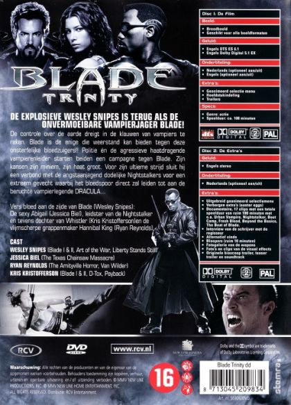 'De explosieve Wesley Snipes is terug als de onvermoeibare vampierjager Blade!'De controle over de aarde dreigt in de klauwen van vampiers te raken. Blade is de enige die weerstand kan bieden tegen deze onsterfelijke bloedzuigers!! Politie én de agressieve haatdragende vampierenleider starten beiden een campagne tegen Blade. Zijn kansen zijn miniem, zijn haat groot. Voor zijn ultieme strijd sluit hij een verbond met de angstaanjagend dodelijke Nightstalkers voor een extreem gevecht waarbij het bloedspoor direct zal leiden tot aan de beruchte vampierlegende DRACULA...Vers bloed aan de zijde van Blade (Wesley Snipes):De sexy Abigail (Jessica Biel), leidster van de Nightstalker en tevens dochter van Whistler (Kris Kristofferson) en de vlijmscherpe grappenmaker Hannibal King (Ryan Reynolds).